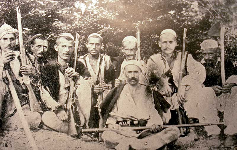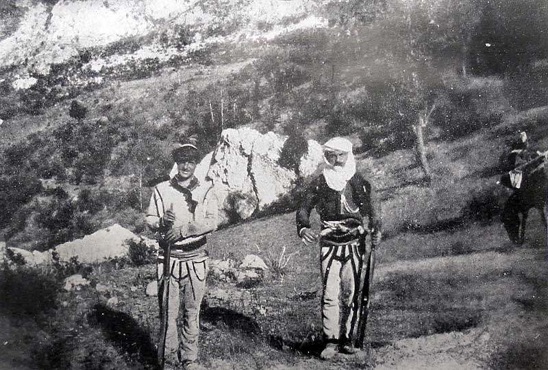 We left Gucia in a group of nineteen men: myself, Zef Doda, Jacob who was my kiraxhi [caravan leader] with three horses, a çaush on horseback and a zaptieh [gendarme]. With us were fourteen foot soldiers armed with Mauser and Martini rifles. Most of these men were Turks from Asia Minor, all young and probably never having been in battle. Half of them were robust peasant lads shouting songs from their Anatolian villages at the top of their voices. One of them, an Asian of a particularly lively temperament, jumped around, danced and cried, despite the fatigue of Ramadan which did not allow him to eat throughout the daytime. The other half were beardless youths, narrow breasted and underdeveloped, quite outdone by a journey through the mountains. […]