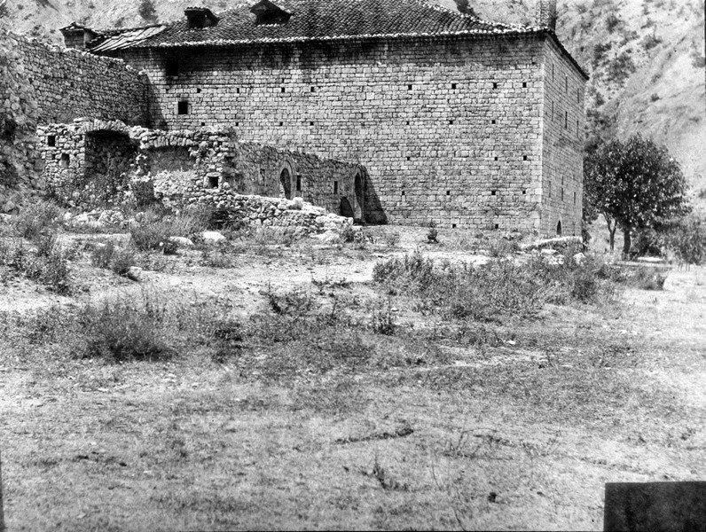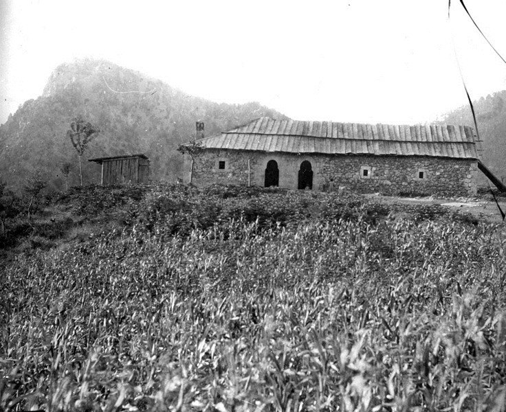 Sufficient proof of this are the rectangular form of the hill, the evident remains of ancient walls fashioned of well-hewed stone, some of which have been set into the walls of the nearby armoury barracks, and lastly the minaret of the mosque, built almost entirely of Roman stone. From Puka, I initially travelled eastwards to Bicaj in the valley of the Greater Fan river and then for a whole day on precarious trails up above the Fan valley southwards to Kalivarja. From Bicaj onwards, I was in Mirdita and had once again joined the aforementioned route used by Steinmetz. The settlements which I passed through in Mirdita, in the bairak of Spaç, were Shmihija, Shkoza and Gojan. I left the valley of the Greater Fan in Kalivarja and climbed out of the verdant valley of the Lumi i Kalivares (Kalivarja river) past Mesul and the mountain pastures of Mushta to the Qafa e Lugjut (Lugj Pass) (1465 m.) on the southern flank of the Munella summit. I left the summit to my left, which Steinmetz was first to climb in 1903 and which the men of Mirdita used as a point of departure for their battles with Essad last year, and climbed, guided by Mark Deda of Domgjoni, through hours of wonderful beech forests in which one could see trenches and obstructions along the way from the recent fighting. We reached the mountain pastures of Domgjoni which conveyed to me, as did those of Mushta, a vivid impression of a typical Albanian bjeshka, and then descended into the valley of the Lesser Fan towards Domgjoni. There I said farewell to Mark Deda of whom I had made great use for my linguistic research. Travelling down the valley of the Lesser Fan, I took the trail past the parish of Fan and spent the night in a secret and hidden spot in the cliffs which is used as a gathering place for the chieftains of the bairak, and reached Orosh, the capital of Mirdita, by the next day.This finely situated residence of the Abbot of Mirdita has been described by several travellers already, notably by A. Degrand in his Souvenirs de la Haute-Albanie, 1901 (Memories of High Albania) and by K. Steinmetz in the above-mentioned work. Situated on a terrace of the mountain which forms the left bank of the Fan, half way up from the bottom of the valley, Orosh, with its splendid church visible from a distance on the southern side and with its spacious abbey, reminds one of our Maria-Taferl. On the opposite side is the village of Orosh which runs up a steep, tongue-shaped slope of the Holy Mountain (Mali i Shejtit).