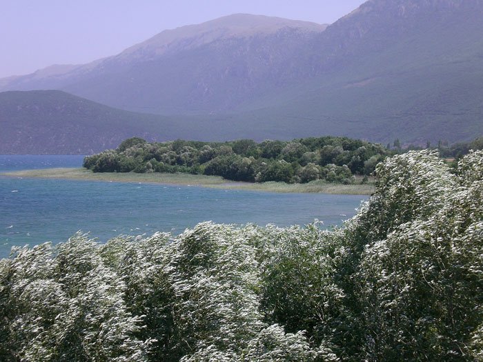 On the small plain to the southwest and on the mountain slopes along the lake one can see several villages, all of them Albanian, although the names of the ones I was told about were Bulgarian: Staròva [Starova] and Pagra-Dìtzka [Pogradec]. I believe the Chkoumbi [Shkumbin] takes its source not far from here. I got the names from Muslim peasants who stemmed from these villages and with whom I spoke in Albanian.