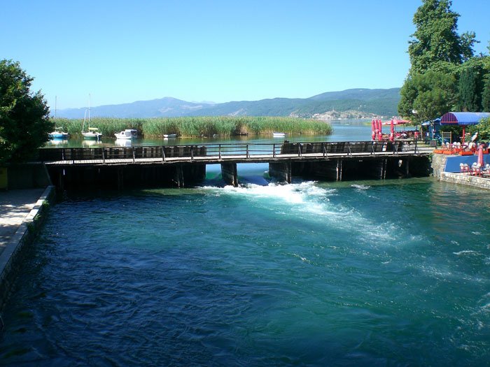 Leaving Okrida, the road continues along the lakeside, separated from the water by a strip of marsh. We arrived in Strouga two hours and twenty minutes later, a depressing-looking town inhabited by Muslims and Bulgarian Christians. The town itself is several hundred metres from the lake, and spans its emissary, the Drin river, which we crossed on a wooden bridge. This is the centre for fishing and the fish trade. The dikes along the river and the draining of the marshes it once flowed through are attributed to the Bulgarian King Samuel (11th century).