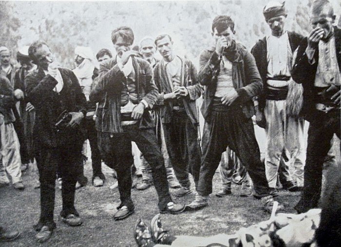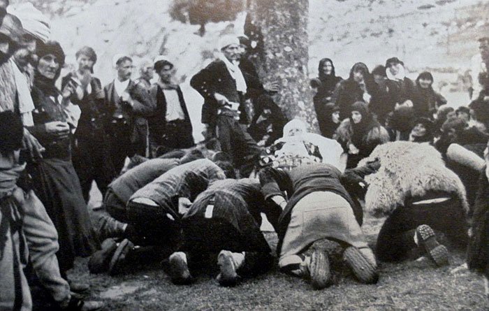 Zwölf Männer aber hielten sich abseits. Etwa hundert Meter vom Toten entfernt ordnen sie sich zu zwei Stirnreihen. Der Anführer steht in der Mitte; er beugt die Knie leicht, holt tief Atem; die Totenklage der Sippengenossen beginnt. Lautes Stöhnen: “Mjeri, o, o, vëllathi i êm -, mjeri – o, o eh, eh!” (“Beklagenswerter, oh, mein Bruder!”). Lauter und stürmischer wird der Ruf wiederholt. Gebärden begleiten die Klage: Schlagen an die Brust, Scheuern an den Schläfen. Dann halten die Männer die Nasen zu und stöhnen ihr “eh, eh, eh.”