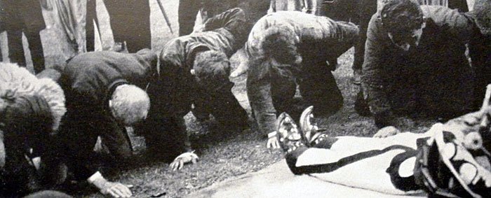 Die Gruppe nähert sich dem Toten einige Schritte und wiederholt die gleiche Folge der Gebärden und der Klageworte. So sind die Männer langsam bis nahe an den Toten herangekommen. Im Halbkreis stehen sie nun um ihn, noch einmal rufen sie ihre Klage, dann fallen sie auf die Knie, lehnen sich vornüber, stützen sich mit einer Hand auf und stemmen die andere in der Seite: “Mjeri, o, o, o!” Mehrfach und gesteigert wird die Klage wiederholt. Dann kommt der Bruder des Toten. Er legt den klagenden Vettern seine Hand auf den Rücken und bedeutet ihnen, daß es genug sei. Die Vettern beenden ihre Klage und erheben sich. Ernst gehen sie zur Seite, um die Zigarette anzuzünden.