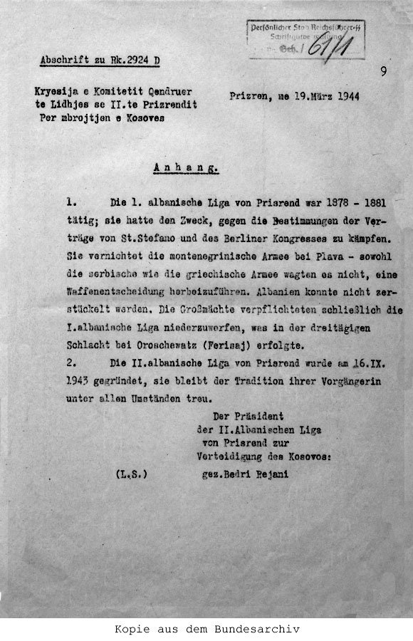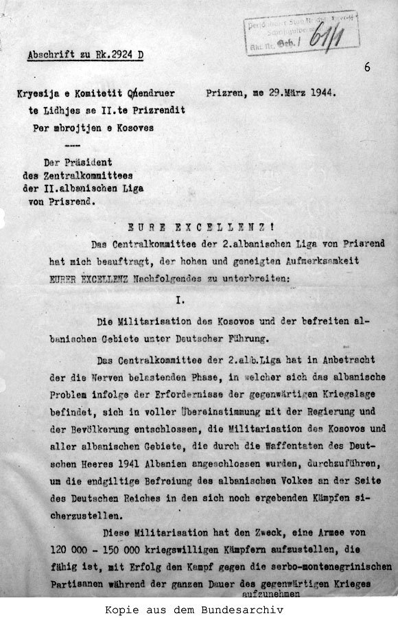 In view of the nerve-racking phase in which the Albanian problem finds itself due to the current military situation, the Central Committee of the Second Albanian League of Prizren, in agreement with the government and the population, has decided to call for the general mobilisation of Kosovo and all Albanian regions that were annexed to Albania as a result of the armed intervention of the German Army in 1941, in order to ensure the definitive liberation of the Albanian people, side by side with the German Reich, in the current fighting.