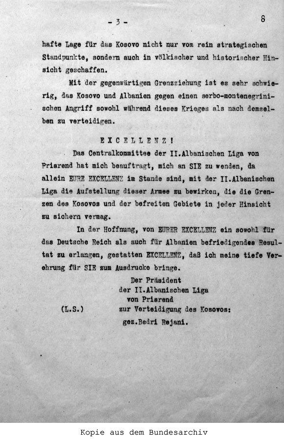 The Central Committee of the Second Albanian League of Prizren has asked me to appeal to you since only Your Excellency is in a position to raise an army, with the Second League of Prizren, that could provide comprehensive defence for the borders of Kosovo and the liberated regions.