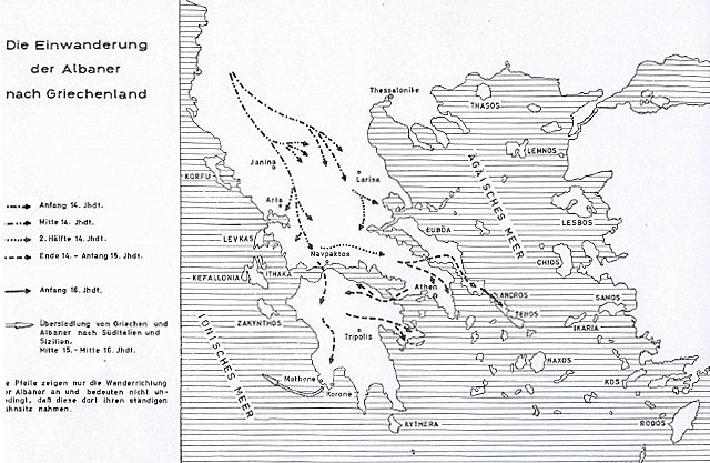 The Albanians first appeared in Thessaly, then in Epirus and subsequently, for various reasons, they migrated southwards, from Aetolia-Acarnania, Attica, Euboea to the islands and the Peloponnese. It is probable that this migration of Albanians southwards went hand in hand with a southward movement of Greeks from southern Albania and northern Epirus. Some of these Greeks no doubt mixed in with the Albanian population. This explains the concordance between place names and personal names in southern Albania and northern Epirus with those in central and, in particular, southern Greece. This concordance is particularly evident in regions where migrants from the north settled.