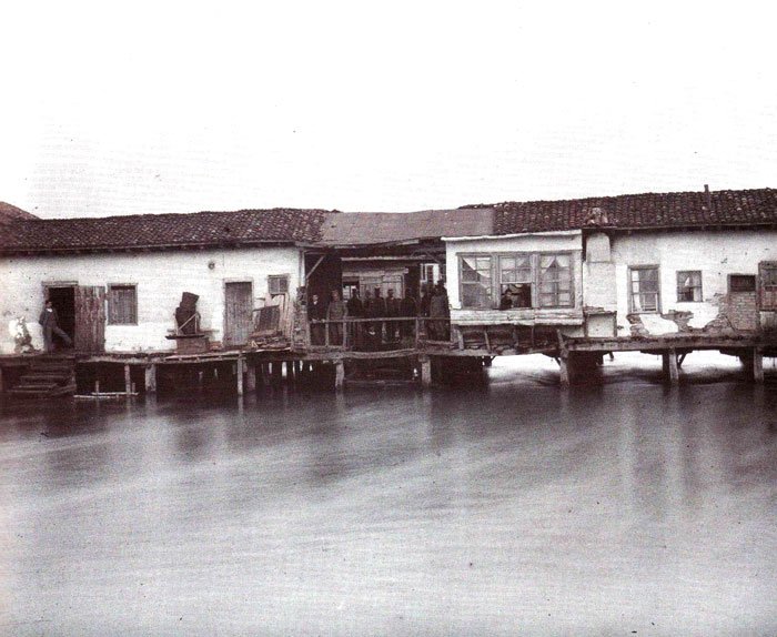 At Struga, the Drin is crossed by a long wooden bridge, beneath which the full clear stream rushes along in a well-defined bed. As we looked down into it, we could see fish of all sizes swimming about in the water; and before long we were able to pronounce on their excellence as an article of food, as we purchased for six piastres (one shilling) a fine pink salmon-trout, of four pounds and a half, off which we made a luxurious repast. The trout and salmon-trout which abound in this lake are rarely, if ever, found in the other lakes of Turkey. Struga is the head-quarters of the fishery, in consequence of the fish resorting at certain seasons to the outlet of the lake, where they are caught in immense quantities. A great part of the population of the place is occupied in catching and drying them, and they are exported to all parts of Turkey, being in great request on account of the frequent fasts of the Greek Church. The fishery is the property of the Sultan, and is sublet by him to contractors for a very large sum. The fishing takes place by night, and has been described to me as a very picturesque and exciting scene. These fisheries and the export of their produce must have existed from very early times, for Strabo mentions “the places for drying fish belonging to the lake near Lychnidus”. The embankment of the sides of the river, by which the neighbourhood was converted from a marsh into a habitable region, was the work of the Bulgarian prince Samuel, at the time when he made Ochrida the capital of his monarchy. Originally the system of desiccation must have been much more elaborate than what appears at present. Anna Comnena speaks with warm admiration of the hundred channels into which the water was drawn off, with embankments and covered watercourses communicating with one another, by means of which the river Drin at length was formed. It was from these works that the place obtained its name, for struga in Bulgarian signifies “a dike, or arm of a river.”
