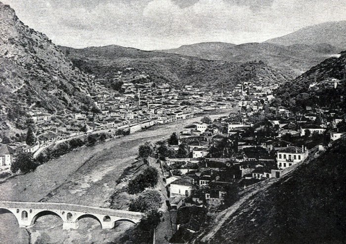 The track which led from this mountain eyrie to the top of the pass was, as our Albanian companion described it in delightful Greek, “all ups and downs and chokefull of stones” (ὅλο ἀνήφορο κατήφορο καὶ γεμάτο ἀπο πέτραις). The ridge bears the name of Glava [Gllava]. The view from the summit is strangely wild. Vast barren mountains rise in every direction, and on both sides of the pass sloping grey clayey hills are seen, seamed with watercourses; to the north some very distant mountains appear, even beyond those of Elbassan and Croia; to the south the eye rests here and there on scattered stone houses, scarcely distinguishable in colour from the soil on which they rest, and showing the wild life of the inhabitants by their resemblance to fortresses, the windows being few and high up in the building; to the west we obtained our first glimpse of the Adriatic. After a long and bad descent, about midday we reached a khan, pleasantly situated in the midst of plane trees, by the side of the stream of the Luftinia [Luftinja], a tributary of the Viosa. The building itself was of solid construction, but its occupants were clad in rags, and showed signs of great poverty; the same was the case with the people whom we met at very rare intervals as we continued our course down the valley: and this, even more than the dreariness of the scenery, impressed us with a strong feeling of loneliness and desolation during this part of our journey. At the distance of three hours from the khan we reached the banks of the Viosa, the largest and swiftest river of Albania – “Laos, fierce and wide,” as Byron calls it – which flows in a north-western direction. The path which we followed from this point along the river side was the only place in our whole journey which could really be called dangerous. In some places it was carried along the edge of a precipice nearly overhanging the water, and at some of the turnings the ground was so much broken away that the horses had difficulty in finding any footing. Fortunately we passed it before nightfall, and forded the river just below Tepelen. The process of fording was not altogether easy, owing to the swift current of the stream; the baggage horse required to be supported across by our four attendants, two of them keeping him up on either side. The distance from Berat is twelve or thirteen hours.