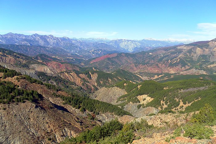 At midday we rested at the village of Sedjin [Shëngjin], where notice had been sent on to the chief man to prepare for our reception. The clay floor of his best room was strewn with a luxurious bed of ferns and a large piece of beef had been dressed and a lamb roasted. The liver was served as first course; but the most remarkable part of the entertainment was the bread, which was baked in circular flat cakes a couple of feet in diameter; these were made of maize, which, when rudely ground and kneaded, is very heavy and heating food. When we had partaken, the rest of the company had their meal; but we observed that our host himself ate apart from his guests, and not until after they were served: this, we were told, is the custom of the country. During this time, one of the numerous storms which had been hanging about the mountains descended upon us, with thunder and lightning and torrents of rain; but after an hour it cleared up, and we were able to pursue our journey under the guidance of our host, who replaced our other guards, as they were to leave us at this point. This man, a wild Albanian, with shaven head and one long lock hanging down behind, looked at first sight like one who might take your scalp at any moment; but, despite his appearance, we found him not only a first-rate guide, but also a most agreeable companion—attentive, considerate, and polite. Our route lay along the mountain sides, through extensive forests of beech and fir, the general direction of our course, both on this and the following day, being towards the north-east. Before sunset we reached the only shelter that was to be found in the elevated region to which we had gradually ascended, a mandra or shepherd’s encampment on the slopes of the mountains facing the north, from which there was glorious view of the serrated, and in some places snowy, peaks of Jacova, which stretch along in that direction in a magnificent chain. These summits are described by Grisebach, who saw them from several points much nearer than this—on the road from Scodra to Prisrend—as presenting a superb spectacle, not easily surpassed in the Alps, from the aiguilles and pinnacles of limestone rock to which they rise. These, he says, form a striking contrast to the lower and less strongly marked shapes of the mountains of the Ducadjini, which, like those of the north and west of the Mirdita, are composed of greenstone, porphyry, and other igneous rocks. The long deep gorge of the Drin is caused by the meeting of these two different formations; and the limestone masses which tower above its northern side he regards as the termination of that system of mountains which, under the name of Carnian, Julian, Dinaric, and Turkish Alps, runs south-eastward from the end of the main Alpine chain. Here it is broken off and thrown up into lofty jagged peaks, exactly in the same way as the dolomite peaks of the southern Tyrol have been formed, and the mountain system terminated in that direction by volcanic upheaval. This range, together with the other mountains which intervene between Montenegro and the plain of Ipek, and are separated by the latter from the Schar-dagh, form the Bertiscus of Strabo, and by that name, as they have no distinctive modern appellation, we will in future call them.
