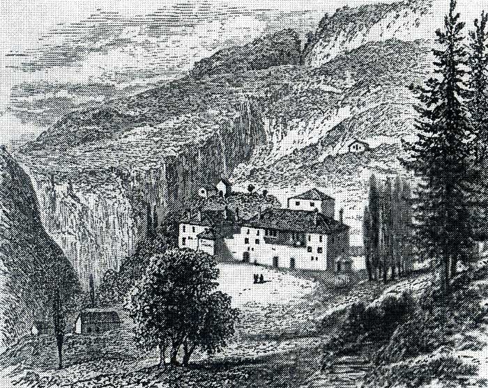 In the course of the day it was proposed to us to make an expedition to the highest point of the mountain behind Orosch, which is called the Monte Santo [Mali i Shejtit]. We were accompanied by Ali Bey with six attendants, three on horseback and three on foot, one of whom, an excessively wild-looking fellow, though clad in the ordinary costume of the country, was a captain; he is said to be a lion in battle, and one would not, I think, be far wrong in recognising in him the son of the ferocious Lech Sii. As soon as we were outside the palace, a feu de joie was fired, the guns being discharged at random, and the bullets flying in all directions about the valley. Our cavalcade mounted the hill-side diagonally by a steep path, until a depression in the mountain-chain was reached; from this we proceeded upwards over grassy slopes to a spring by the side of a cavern, in which in former times was a chapel of St. George, though now it has been destroyed by a fall of rock. While we were resting at this place, a little diversion was caused by an accident happening to my saddle, which nearly resulted in the loss of that important part of a traveller’s equipment. One of the Albanian attendants, wishing to make fast his horse, had attached his saddle to the stirrup-leathers of mine. The horse became fidgety, and at last by continual pulling dragged the saddle over the hindquarters of my horse, a process which the bad girths of the country render comparatively easy; and then, finding himself encumbered with this unusual appendage, took fright, and galloped off across country at full speed with the unhappy saddle trailing behind him. After he had gone about three-quarters of a mile, he pulled up, and one of the men was sent to secure him: meanwhile I had requested to be mounted on another horse, and we proceeded up the mountain. At last we reached a very steep part of the path, called the Scala Santa, where the rock was broken in steps (it was curious to hear the Italian words mutilated by the Albanians); and on reaching the top of this we found a rude stone church, dedicated to St. Benedict, with the ruins of an old Benedictine monastery, close to which rose a clump of finely grown elms, the only ones which I saw in the country. Of the history of the place we could learn nothing.