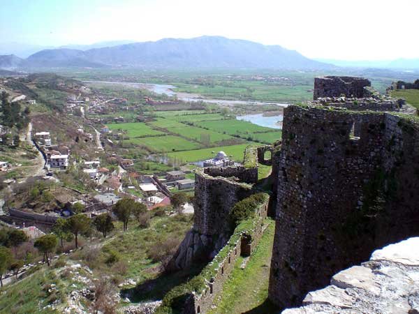 The square-shaped fortress of Lezha is situated on a promontory over the banks of the Drin. Its small ramparts were skilfully fashioned, but they are not in good repair, even though the fortress is on the frontier of the Venetian Franks. It was originally constructed by the doges of Venice.