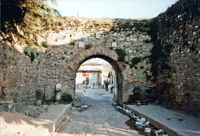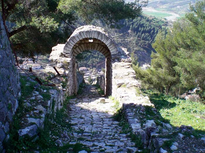 The fortress of Berat was conquered from Constantine the Greek and the Albanians. Shape of the fortress. Built like a candlestick on a steep and bare cliff stretching in a north-south direction, it is a mighty, solid and enduring fortress constructed of hewn and polished stone. Since it is in the interior of the country, it has not been kept up and its wall are now damaged in places. The total circumference of the fortress is 2,600 large paces. It has four strong and solid gates. First, facing north, is the Big Gate: from it down to the bazaar is a distance of 1,000 paces. This gate has three large doorways which are separated from one another by a distance of 100 paces each. Two of these doorways look towards the north, and the third one, the inner doorway, opens to the east. The foundation stones of the gate are as big as the body of an elephant. Such stones can otherwise only be found in Hebron near Jerusalem and in the fortress of Bender on the banks of the Dniester river. The second gate, below an ancient monastery, faces west and opens out onto the road which descends to the front of the new mosque built by Hüsein Pasha in the Murad Çelepia quarter. The third gate faces east between the quarters. It is a small, hidden gate and is not used very much.