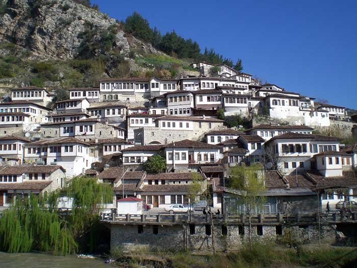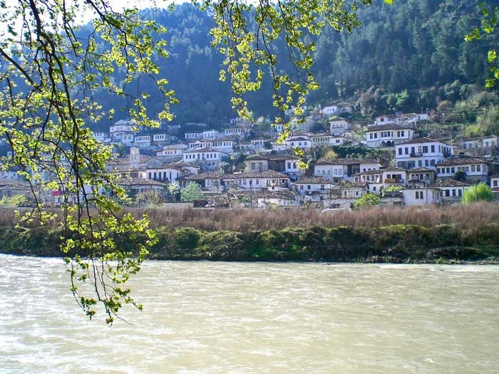 The large open town of Albanian Belgrade (Berat). It is a huge open town, entirely outside the walls of the fortress. It is situated in a large area along the bank of the […] river to the east and south of the upper fortress and is covered in vineyards, rose gardens and vegetable gardens. There are 5,000 one- and two-story stonework houses with red-tiled roofs. They are well built and attractive houses with gardens and are spread over seven verdant hills and valleys. Among them are over 100 splendid mansions with cisterns and fountains and an invigorating climate.