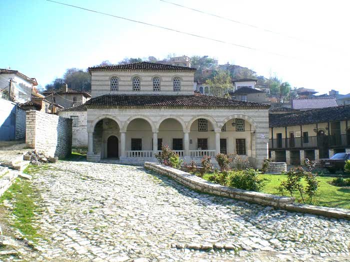 Mosques of the Ottoman sultans. Berat has 30 prayer niches in all, of which the one with the largest congregation is the Mosque of Sultan Bayazid II the Saint (9) in the centre of town. This mosque is 60 feet long and 50 feet wide with a tall, graceful minaret. It has three doors – two at the sides and one in the qible wall. In front of the mosque is a porch which is as large as the mosque itself, though the courtyard is narrow. The mosque was constructed in the old style and has a completely tiled roof. In front of the prayer niche is the octagonal two-story Tekke of […] Efendi. It is a Halveti tekke.