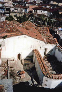 Outside the castle of Berat there is a total of 200 dilapidated houses with tiled roofs, most of them inhabited by Greek infidels. They have very big yards, but the gardens are not kept up. There is one isolated congregational mosque, that of Bayazid Khan (3), covered in tiles. It is a large old mosque with a stone-carved minaret, but with no congregation. There are eight churches, of which one is very large and well built. The streets are paved with unworked cobblestone. On the four sides of the fortress there are houses built against the walls. It has no moat on any side because it is surrounded by sheer gorges.