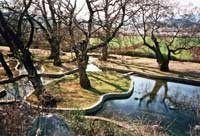 Büzürg Seng (Big Rock) Park, outside the town on the south side across the Shkumbin river, is a resort for lovers in a large open meadow full of palm trees and rose gardens. The Albanians call this spot Boz Eshek (Grey Donkey), a corruption of Büzürg Seng; and indeed, there is a big rock in the middle of the green meadow, which is why it is known as Büzürg Seng (49). It is a beautiful natural setting, without its like in Turkey, Arabia and Persia. Rising into the heavens are hundreds of plane trees, poplars, oaks, cypresses and willows, planted in rows. On all sides are orchards and gardens of roses and other flowers. Water flows continually through the various pavilions and pleasure domes with their pools and fountains fitted with water jets. These buildings are equipped with many kitchens and well-stocked pantries and the park is ornamented with numerous wrought iron trellises and bowers. The water from the jets is projected up into the branches of the plane trees, like the Water of Life.