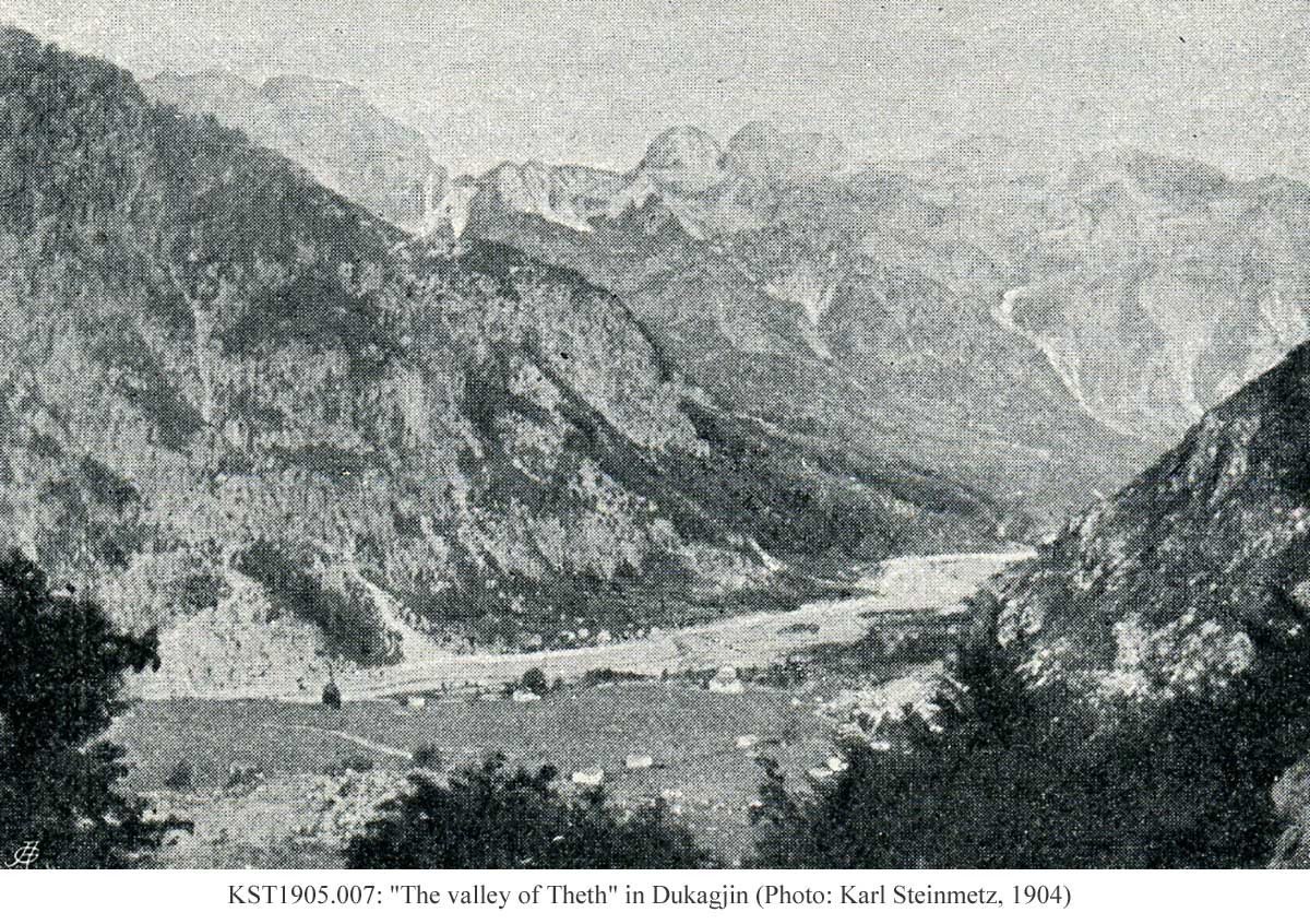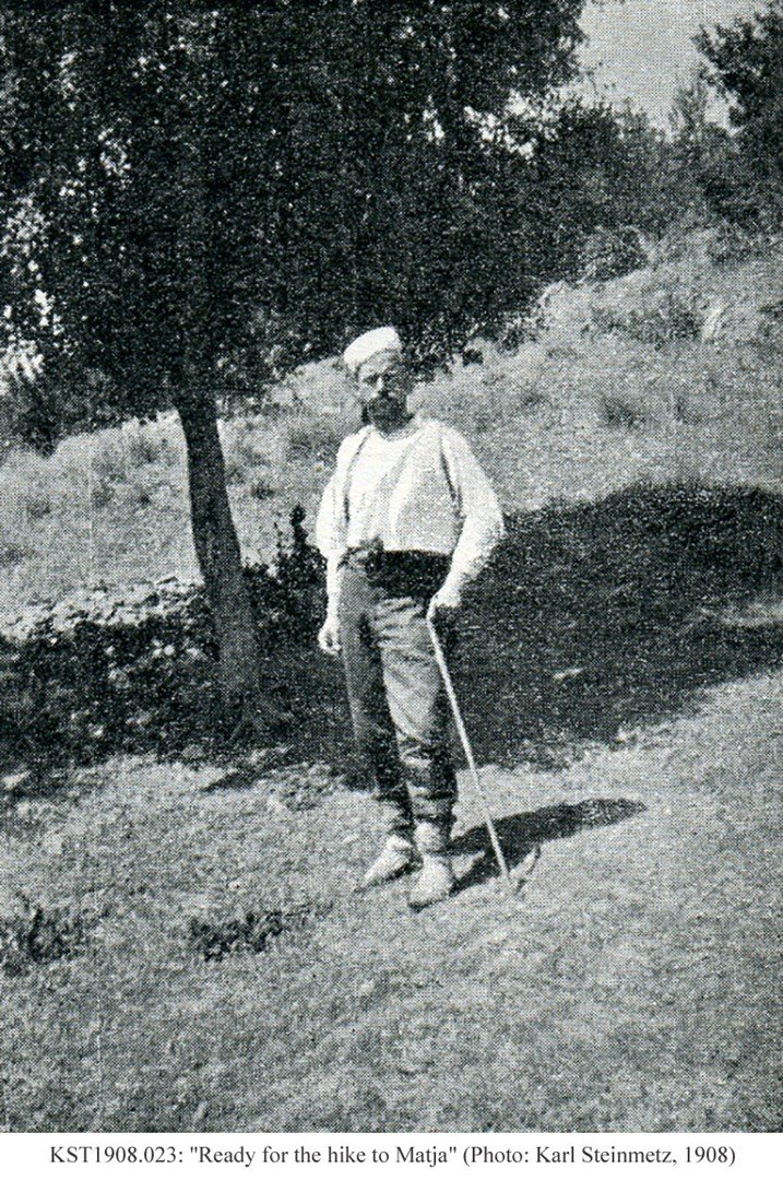 The Austro-Hungarian explorer and travel writer, Karl Steinmetz, was an engineer by profession. After an extensive trip to South America, he journeyed several times through the Ottoman Empire before venturing into its wildest part, the mountains of northern Albania. In August 1903, he set off on an expedition through the mountains from Shkodra to Gjakova and Prizren in the summer heat. Soon after his arrival in Skopje, he sailed right back to Albania by steamer from Salonica to San Giovanni di Medua (Shëngjin) where he arrived on 12 September, to begin a second expedition which took him through Mirdita for two weeks and back down the Drin Valley to Shkodra. In August 1904, he returned to Albania to explore the northern mountains once again. This journey took him though similar territory, but slightly to the north, through the high mountains of Shkreli, Theth, Shala and Merturi on to Gjakova. A third expedition in 1908 took him once again through the northern mountains, this time in the direction of Mat and the valley of the Black Drin in Dibra country. Steinmetz’s travels are described in his three German-language books: “Eine Reise durch die Hochländergaue Nordalbaniens” (A Trip through the Highlands of Northern Albania), Vienna 1904; “Ein Vorstoß in die nordalbanischen Alpen” (A Venture into the Northern Albanian Alps), Vienna 1905; and “Von der Adria zum Schwarzen Drin” (From the Adriatic to the Black Drin), Sarajevo 1908. Together with Baron Nopcsa and Edith Durham, he was regarded as one of the best informed foreign travellers of northern Albania in his day. Nopcsa called him a reliable expert on Albania. Karl Steinmetz learned Albanian and was the author of an Albanian grammar and dictionary: “Albanische Grammatik: nordalbanische Mundart” (Albanian Grammar: Northern Albanian Dialect), Sarajevo 1913; and “Deutsch-albanesisches Feldwörterbuch” (German-Albanian Field Dictionary), Sarajevo 1913.