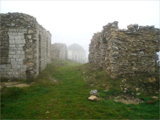 Ruins of the Bektashi teqe (dervish lodge) of Melçan, on a hilltop near Korça in southeastern Albania, in the damp morning mist (Photo: Robert Elsie, November 2010)