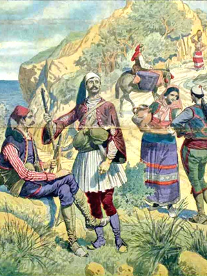 Thereupon he changed his name, calling himself Kordha the Sabre, and inscribed this name on the sabre itself. Then he hugged his mother, and they kissed because they were to separate and wept many tears. Once they had said their good byes, the youth kissed his sabre for luck and departed, saying, “Farewell and please wish me well for I will not be back for six months.” After leaving the village, he wandered through the countryside for five or six hours until he came to a mountain. There was not a soul to be seen. The youth sat down on a flat patch of ground, drew his sabre, kissed it and placed it on his lap. Hardly had an hour passed when another youth of his age came by and greeted him. “Hello,” answered Kordha, “Where do you come from and where are you going?” “I am in search of my fortune,” replied the other. “I, too, am in search of my fortune. Let us become brothers and travel together.” They hugged and kissed and told one another their names: one was called Kordha and the other Ylli the Star. Then they set off together and walked until it got dark, when they lay down and went to sleep without dinner.