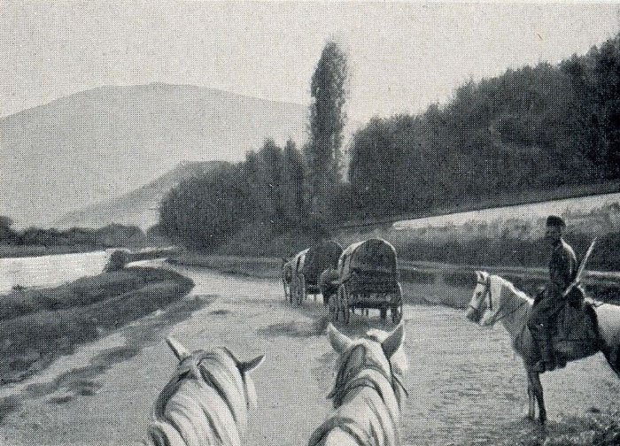 However, when our coachman asked for directions through the marsh, our choir suddenly fell silent and tried to sneak away as rapidly as possible. We took pity on these kind people and were satisfied with a simple show of the general direction we were to take. But we soon discovered that our pity had been misplaced because the coachman began to look worried and the horses and carriage sank more and more into the mire. We then caught sight of a peasant who was walking through the marsh in the opposite direction, not far from us. We hailed him over and he explained to us that he was looking for a cow. He was not sure whether it had gone astray or had been spirited off by the Albanians or by a wolf. We asked him if the animal was wont to wander only in the direction he had taken, which he denied with some perplexity. We thus decided that he might as well come with us and that we would give him a tip for his services. It was evident from the expression on his face that he was perplexed at why we were offering him a tip when we didn’t have to, but simply replied “yes, sir” and got in. Without wasting any time, the major began to question him and got some information out of him about the bifurcation of the Nerodime, but it was so confusing that we had to ask him again and again. In the end, he was so petrified that he held his index and middle finger up in a V form and shouted: “See, my lord, at low water the creek does this!” I suddenly understood what he was getting at, and when the peasant realised from the questions that I understood him, he laughed aloud and continued to hold his fingers up to me, calling on Christ and the saints as his witness to convince me that he was telling the truth.