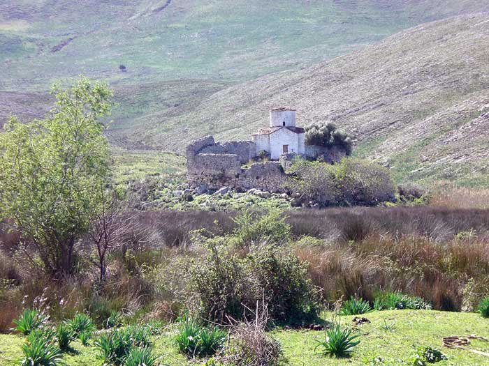 We soon arrive in sight of Khimára, situated on the top of a pointed hill, and enter upon the cultivated land which surrounds it, consisting of extensive vineyards, some fields of wheat just springing up, and others of barley, which the peasants are ploughing, and will sow as soon as they can catch a short interval of fair weather. On a high summit under the mountains on the right is a monastery of the Panaghía, on the left the port of Khimára, near the shore of which are some water-mills, turned by a rivulet from the mountain. The harbour is exposed to the west, but affords good shelter to small vessels from any other wind, and has a fine beach. There is another more open spiaggia, two miles farther to the north, immediately below the town, where boats are hauled up on the beach. Here is a small plain which, with the side of the hill between this plain and the village, is the best cultivated part of the territory of Khimára. Immediately below the village are some gardens, containing vines, olives, cypresses, and fruit-trees.