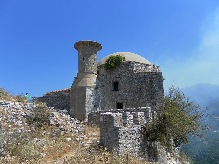 At 12.45, after a continual ascent from Dúshari, we arrive at the Komméno Lithári, or Cut Rock, in Albanian Guri Prei. This is a small rock rising from the crest of a ridge which ranges with Mount Lénia, and divides the hollow of the river Khelidhóni from that of another principal branch of the Devól, which flows along the eastern side of Mount Tomór. The ridge being exactly at this point lower and more accessible than in any other part, the “Cut Rock” is the natural point of communication from the one valley to the other, and for that reason has been occupied by a castle which surrounds the rock. Komméno Lithári was taken from the Pashá of Berát, about seven years ago, by Alý who now holds it with a garrison of a dozen dirty half-starved Albanians. The fort is nothing but a thin wall, surrounding a quadrangular space, in the centre of which rises a kula, or small keep, standing upon the lithári or rock itself: this tower was formerly the only fortress. The poor soldiers have a few chambers with fire-places in the tower, but so dirty and miserable that I prefer remaining on the flat roof of the tower in the midst of fog, rain, and wind; doubly chilling after the late sultry weather in the plains. The soldiers complain of the cold in winter, when the snow lies on the ground for several months; but still more of the wind, which rushes through this lofty opening in the ridge, in concentrated blasts from whatever quarter it may come. Mutton they contrive to obtain occasionally, as even in winter some sheep remain in the sheltered vallies, and sometimes a little kalambókki, but neither wine nor spirits, their taim consisting only of koromána, or black bread: and having never yet received any pay, they must rob, starve, or desert, but for the contributions of passengers.