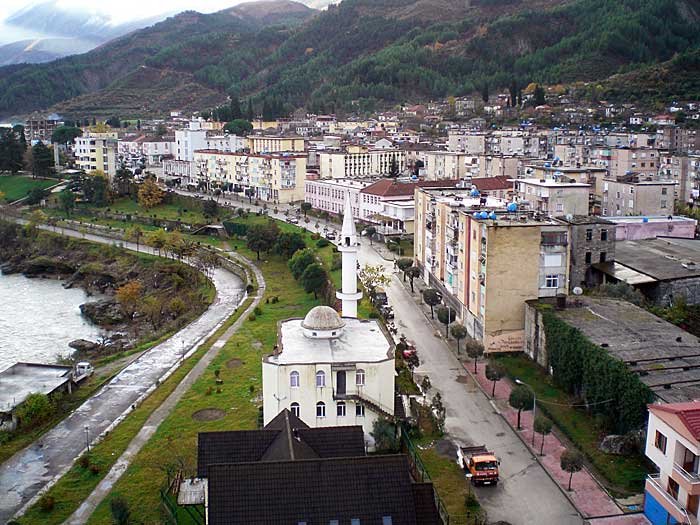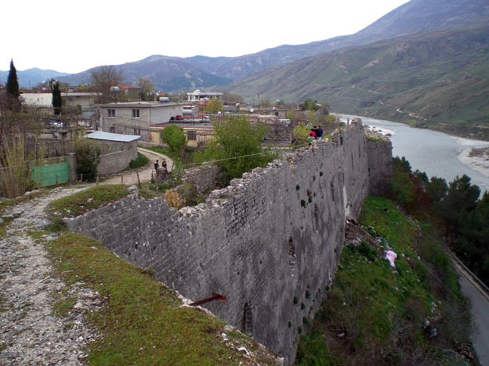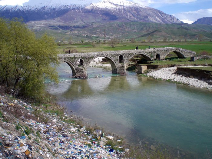 Immediately above Tepeléni, the piers of a ruined bridge stretch across the Viósa, the arches of which were carried away three years ago by an inundation, and are now supplied by a temporary wooden communication. From the opposite bank of the river rises a steep and lofty mountain, named Trebushín [Trebeshina]; on the side of which are a Tekiéh, or convent of dervises, and a village named Petzísti [Beçisht].