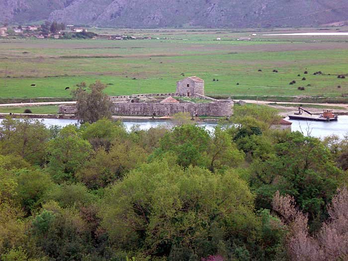 As we approach Vutzindró, the water becomes muddy, and in the bay is almost fresh. This bay is very shallow on the northern side, and the bar at the mouth of the river will even now, when the water is at the highest, but just admit of the entrance of καΐκια, or small coasting vessels. We row three or four miles up the river, through a plain once perhaps the property of Atticus, the friend of Cicero, and now peopled with horses from the neighbouring villages. We then arrive at the Vivári, or more vulgarly Livári; that is to say, the principal fishery, which is on the left side of the river, at its exit from the lake, nearly opposite to the peninsula which was anciently occupied by Buthrotum. The only buildings at the Livári are a ruined house of Venetian construction, and near it an old triangular castle, occupied by a dirty bilibásh of the Vezír, and fifteen or twenty soldiers. The place is called Βουτζιντρὸν, vulgarly pronounced Vutjindró: the territory comprehends all the lake, and a part of the surrounding hills. In the house live the superintendent of the fishery and fourteen Greeks, who are employed by him. The fish are caught by means of a strong permanent dam, made of large beams, crowned with a palisading of reeds. At intervals are small chambers in the dam, where the fish are taken in passing out of the lake. A man who is on the watch, gives a signal for shutting the door as soon as the chamber is full. There is a second dam above the first, for the purpose of breaking the force of the water, but the late violent rains have carried away great part of it, and injured the fishery for the remainder of the season, which usually lasts from September to March. The yearly average quantity of fish caught is 350,000 litres, or Greek pounds, which are the same as the Venetian. This year, though the season is only half over, they have caught 400,000. The fishery is farmed from the Vezír for fifty-five purses by N. Y. of Kalarýtes, the bishop of Ioánnina, and G. Z. of the Forty Saints. In the same farm is included the fishery of a smaller lake named Riza, to the south-eastward of the great lake; that of a lagoon called Armyró on the northern side of the mouth of the river, the pasturage of the marshy land near the river and lake, and the privilege of cutting wood (but not construction timber) in the forests and marshes of the territory of Vutzindró, as it was defined by treaty between Venice and the Turks. Beyond that line the wood-cutters pay for the privilege to Koníspoli [Konispol], which possesses all the south-eastern part of the fine plain, extending from the southern extremity of the lake to the foot of the hills which border the Channel of Corfú in face of the city.