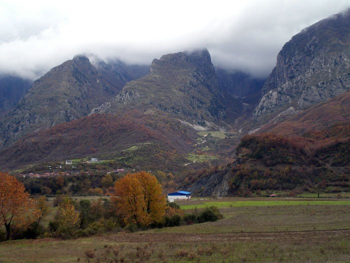 Sept. 12. — At 6.40 we leave Lávdhari, pursue the side of the mountain, and, in the neighbourhood of two or three small villages, pass through several gardens, where the cornell and walnut are mixed with pear, apple, and some other fruit trees, which, being the growth of colder climates, are either not found or rarely found in Southern Greece and the Morea. Having then descended, we cross at 7.45 a branch of the Khelidhóni, coming from the south, and from thence ascend to Protopápas, which, notwithstanding its name, is now entirely Musulman, and has a mosque with a minaret, a distinction proper to be mentioned, as this picturesque adjunct of the mosque is by no means general in Albania. The road in many places is destroyed by the late rains, and in all parts is so extremely bad that our pace is very slow. The tediousness, however, is in great measure compensated by the beauty and sublimity of the prospect. Though the sky still lowers, the weather is less threatening, and admits a view of the great summits at intervals. Occasionally they are illuminated by the sun, while fleecy vapours are seen settling on the ravines and vallies. Sometimes we find ourselves in the midst of these vapours unable to see more than a few feet before us, until suddenly the mist clearing away, shows the highest mountains in that partial manner which never falls to augment their apparent height and magnitude. Continuing to ascend over rugged hills, we halt for 15 minutes at 10.45 at Dúshari, situated under a woody peak called Bófnia, the continuation of the Khópari range: half an hour before Dúshari we crossed a stream from the south, which unites with the Khelidhóni near its junction with the Devól, of which the previous course was from the north-eastward, but which, after the junction, flows along the south-eastern side of Mount Lénia.