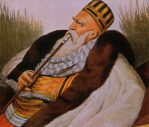 These minute observations, however, were not made at the time of our entrance into the apartment. All our attention was at this moment occupied by the person of Ali Pasha himself, whose figure formed the most interesting part of the picture that was before us. He was sitting in the Turkish manner, with his legs crossed under him, on a couch immediately beyond the fire, somewhat more elevated than the rest, and richer in its decorations. On his head he wore a high round cap, the colour of the deepest mazareen blue, and bordered with gold lace. His exterior robe was of yellow cloth, likewise richly embroidered, two inner garments striped of various colours, and flowing down loosely from the neck to the feet; confined only about the waist by an embroidered belt, in which were fixed a pistol and dagger, of beautiful and delicate workmanship. The hilts of these arms were covered with diamonds and pearls, and emeralds of great size and beauty were set in the heads of each. On his fingers the Vizier wore many large diamond rings, and the mouthpiece of his long and flexible pipe was equally decorated with various kinds of jewellery.