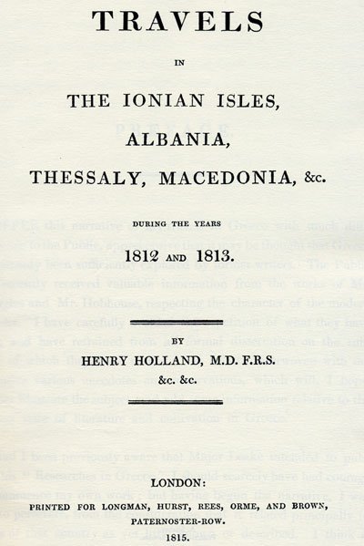 [Excerpts from Henry Holland: Travels in the Ionian Isles, Albania, Thessaly, Macedonia, etc. during the Years 1812-1813 (London: Longman, Hurst, Rees, Orme and Brown, 1815), p. 99-199, 475-500.]