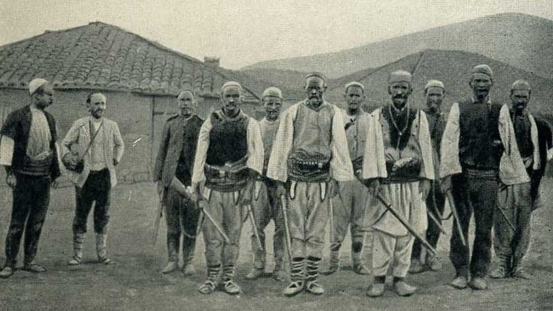 There he stood, a bit in front of a dozen fine men, the oldest of whom were just as upright and sturdy as the younger ones. The clothes that many of them were wearing were different from those of the Albanians in the lowland towns. Their white flannel or woollen trousers with black trim were baggy and were closed at the ankles with gaiters. Their woollen shirts were replaced by a wide cloth garment that fell to their knees. Over it, all of them were wearing a vest or bolero of more or less coarse cloth but also more or less embroidered. The vest of the chief was luxurious compared to the rest, and he had a silver chain around his neck. The white skullcap, as round as that of an altar boy or flat like a travelling bonnet, was standard apparel for all, as were the rawhide sandals and the wide sashes in which each of them had stuffed cartridges, weapons, tobacco, watches and such provisions. A further complement to this costume were the rifles over their shoulders. You can imagine the impression they made on me when I first caught sight of them.