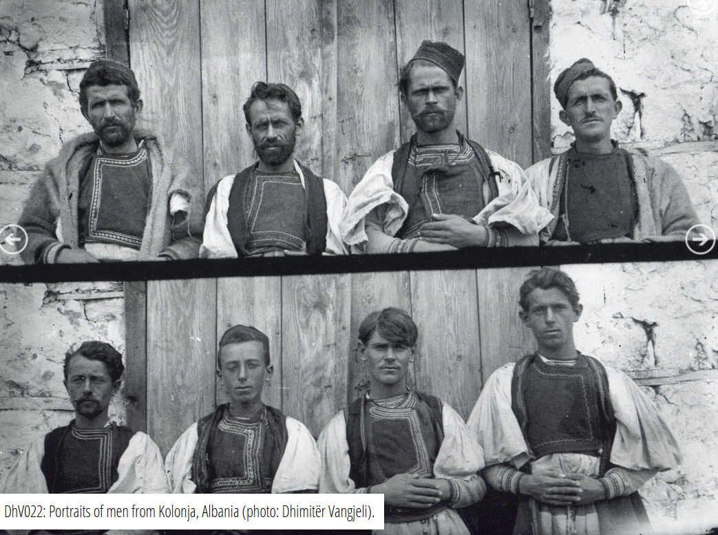 Dhimitër Kristo Vangjeli (1872-1957) wurde im Dorf Prodan im südostalbanischen Kolonja-Gebiet geboren. Als junger Mann arbeitete er in Griechenland. Nach seiner Rückkehr nach Kolonja eröffnete er in Erseka einen kleinen Laden, auf dessen Schild stand: „Süßwaren, Uhrenmacher, Fotograf“. Vangjeli, der das Handwerk des Fotografierens von einem Meister in Korça gelernt hatte, wurde mit der Zeit zu einem der großen Fotografen Südalbaniens. Tätig war er in Kolonja vonca. 1900 bis ca. 1945.Vor wenigen Jahren wurde im Archiv des Museums von Erseka eine schwere Munitionskiste entdeckt, die ca. sechzig Jahre, wohl aus Angst vor Sprengstoff, ungeöffnet war. Als die Polizei zur Öffnung bestellt wurde, entpuppte sie sich als Schatztruhe. In ihr befanden sich die Glasplatten der alten Fotos des Dhimitër Vangjeli. Erseka und Kolonja können auf die Entdeckung stolz sein. Bald darauf gab es eine Ausstellung in Tirana, und im Jahre 2016 wurde ein Fotoalbum mit dem Titel Kolonja through the Photos of Dhimitër Vangjeli mit einigen Meisterwerken des Fotografen herausgegeben. Eine kleine Auswahl dieser Fotos wird hier nun vorgestellt.